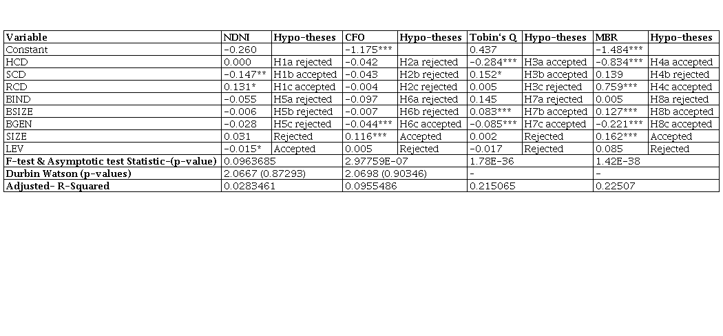 LEV results in this study have a mean value of 0.542 and a standard deviation of 1.321. This means that companies in ASEAN-5 use funding from debt amounting to 54.2% of total equity. This is consistent with the results of research showing that most sample companies have a high amount of LEV. Thus, it can be seen that more companies use LEV for corporate funding compared to equity. The highest LEV is owned by BBW (SGX) in 2015, with a value of 11.344. The lowest LEV is owned by 5NK (SGX) companies in 2017, with a value of -13.847. This negative result is due to the fact that in 2017 the company suffered a loss so that the company‘s total capital was negative. SIZE has mean and standard deviations of 12.167 and 0.712. Thus, it can be seen that the average natural logarithm of the company‘s total assets is 12.17, whose value is equivalent to 1,469,090,808,239 rupiahs. The maximum value of SIZE is 14.663 owned by the company Z74 (SGX) in 2017, the value of which is equivalent to 460,776,323,189,952 rupiahs, while the minimum value of SIZE is 10.074 owned by the 5NK (SGX) company in 2011, which is equivalent to 11,860,075,649 rupiahs. The regression test in Table 10 shows that the coefficient of determination (R.) is 2.84% for NDNI, 9.55% for CFO, 21.51% for Tobin‘s Q, and 22.51% for MBR. This shows that the independent variables of this study (HCD, SCD, RCD, BIND, BSIZE, BGEN) are able to explain 2.84% of NDNI variables, 9.55% of CFO variables, 21.51% of Tobin‘s Q variables, and 22.51% of MBR variables, while the remaining 97.16% (NDNI), 90.45% (CFO), 78.49% (Tobin‘s Q), and 77.49% (MBR) are influenced by other variables outside the study.