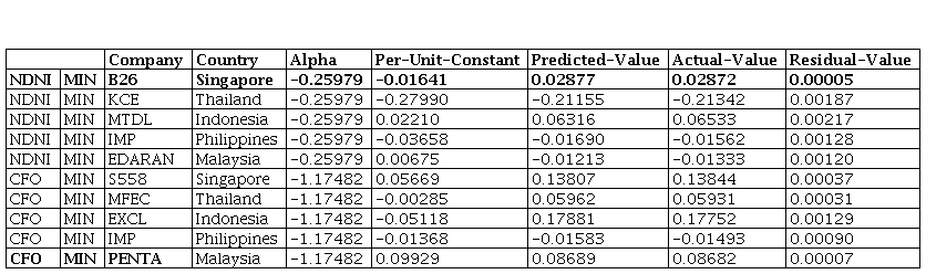 In the panel data, there are two model categories: The model with individual effects (fixed and random effect) and the model without individual effects (common effect). The most appropriate panel models for NDNI and CFO are the random effect models. Hence, NDNI and CFO have individual roles which can be observed through the difference of constants per unit for each individual, whereby the constants demonstrate the ability of the prediction model that is used in the study on sample firms. Table 11 displays the list of companies from the five sample countries with the lowest residual values. It is found that the five companies have similar CG characteristics, with large BSIZE numbers and small BGEN numbers. It implies that the firm’s BSIZE is large and dominated by males. Conversely, the lowest residual value based on the difference of prediction value and actual CFO has small BIND. From the five sample nations, the NDNI model prediction gives the most robust result on B26 and SGX. The CFO model prediction granted a strong result to PENTA and BM since its residual values are the lowest.
