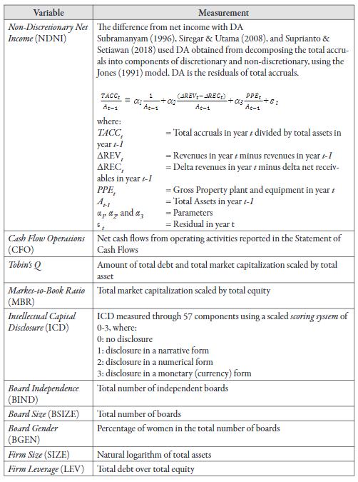 Non-Discretionary Net Income (NDNI) and Cash Flow Operation (CFO). The profit reported in Profit or Loss Statement is accounting profit, which contains accrual aspects. This aspect is the instrument used by management to conduct EM. Subramanyam (1996), Siregar and Utama (2008), and Suprianto and Setiawan (2018) introduced NDNI and CFO as actual profit performances independent from the effect of EM. Zhu et al. (2015) provided evidence that EM tends to affect the firm‘s future performance negatively. To measure the transparency of a company, an indicator frequently used by investors is profitability (Hatane et al., 2019). ROA, one of the measurements of profitability, is classified as the accounting based measurement of financial performance. The positive result of ROA means that the asset owned can generate income for the company (Masa’deh et al., 2015). Hatane et al. (2019) found that ICD components are positively associated with NDNI, and that NDNI and CFO directly affect stakeholders in determining firm performance and making decisions. As such, these two measurements are considered to be the most reliable.