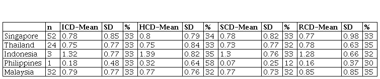 Table 3 exhibits the order of ICD percentage, from the highest to the lowest, namely Indonesia, Malaysia, Singapore, Thailand, and the Philippines. The ICD mean shows the average amount of IC disclosures made by companies per country for 8 years. The highest yield is owned by Indonesia, which is 1.32. This might be because the sample used in Indonesia consisted of only 3 companies and all of them had done the ICD well. The lowest yield is owned by Philippines, which is 0.18, however, this is because the Philippines sample only consists of 1 company, so there is no other comparison to evenly distribute ICD results in Philippine companies. The HCD, SCD, and RCD mean shows the average amount of HC, SC, and RC disclosures made by companies per country for 8 years. As seen from the percentage of HCD, SCD, and RCD, Singapore, Thailand, Indonesia, and Malaysia have nearly-equal-percentages, whereas the Philippines has an HCD percentage that is much higher than its SCD and RCD. Singapore has the highest-HCD, followed by Indonesia and the Philippines, while Thailand and Malaysia own the highest RCD. On average, HCD is the highest, with RCD and SCD after that.