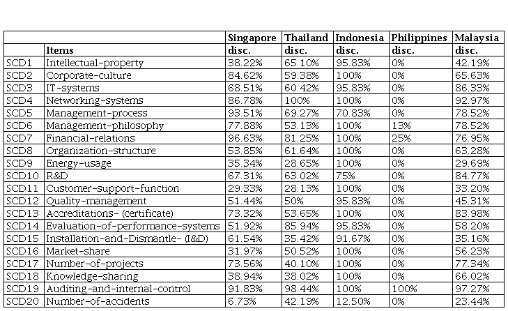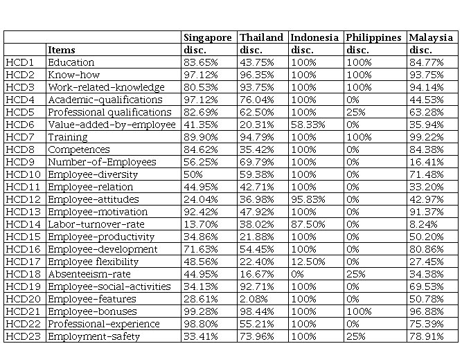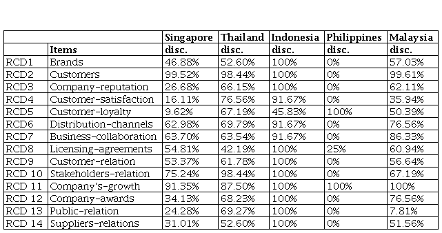 Tables 4 to 6 contain ICD items that are compiled from several research papers by Nimtrakoon (2015), Zéghal (2015), Cabrita et al. (2017) and Yang (2018). The-disclosure column-in these tables indicates how often a firm discloses IC. It can be seen that the country with the most ICD is-Indonesia, while the Philippines has the lowest ICD percentage. Results-show that-the most disclosed items in HCD are benefits and bonuses to employees, which means that sample firms have given bonuses proportionate to the benefits their employees have provided them. For SCD and RCD, the most disclosed items are a system of auditing and internal control, and customers. It proves that the ASEAN-5 have-an audit system and internal control that supports the performance of a firm and has built a good relationship with customers.