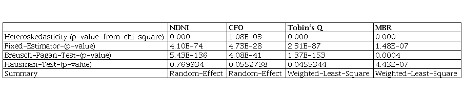 Table 7 illustrates the classic assumption and data panel test. The test is done by first testing the robust standard errors. The goodness of fit test uses data panel regression, which is a random-effect model and WLS model. Table 7 proves that no variable passes the heteroscedasticity-test, as all variables have Chi-square-values >0.05. NDNI and CFO have a p-value from the Hausman test >0.05; thus, the model should use the random-effect model. At the same time, Tobin‘s Q and MBR-have p-value from Hausman test <5%, so the model is fixed-effect. However, both also have heteroscedasticity problems; accordingly, the most appropriate model is WLS.