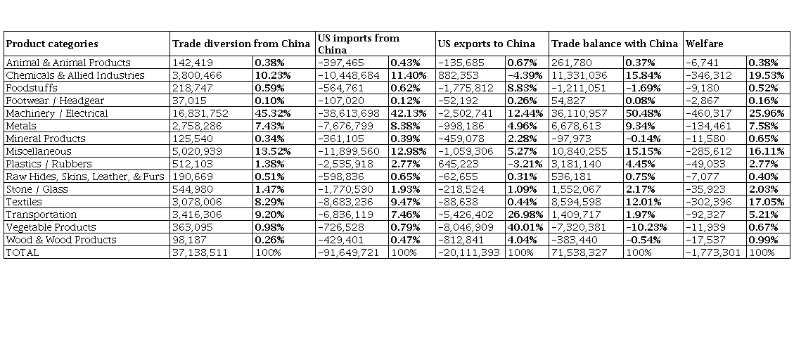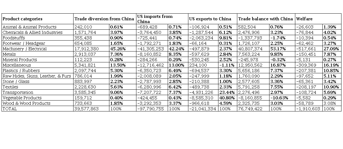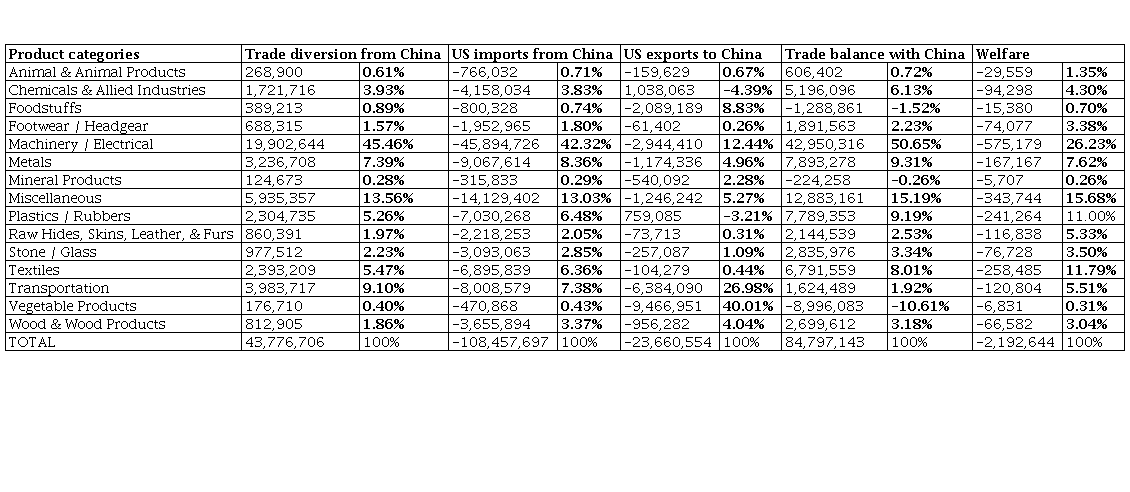 Appendix B shows that the US targeted China’s machinery and electrical products, while China targeted America’s agricultural and automobile sector products with its imposed tariffs. The latter consequences were already visible in the market given the many complaints from the US farmers and car producers, who claimed that the trade war had cost them China’s market. On the other hand, it is evident from Appendix B that the US will significantly improve trade balance with China not only for machinery and electrical products but also for miscellaneous products. This includes medical instruments, arms, and ammunition, furniture, etc. Unfortunately, the US welfare will be hurt the most by the product categories that received the heaviest import tariff burden.