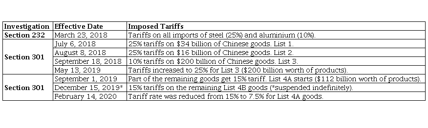 During his campaign rally in 2016, Donald Trump accused China of the greatest theft in the world and promised to fight unfair trading partners’ practices if he was elected. After Donald Trump took the office, Section 232 of the Trade Expansion Act of 1962 investigations were launched in June 2017 that concluded that the imported steel and aluminium “were threatening to impair the national security” and recommended to “take action to protect a long-term viability of the nation’s steel and aluminium industries” (Presidential Memorandum, 2018). The method selected to fight unfair trading partners’ practices – import tariffs – breached global trading rules and put the idea of free trade on a test. The import tariffs on all steel and aluminium imports amounting to nearly 18 billion USD were implemented in March 2018. The first China-specific tariffs were imposed after the Section 301 of the Trade Expansion Act of 1974 investigation on July 6, 2018.