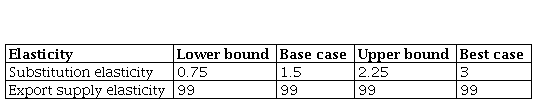 The direction of changes in the model values was expected. For example, under the higher substitution elasticity, the loss in welfare was lower because the consumers could more easily switch to other goods. The disaggregated model results also suggested that changing substitution elasticity did not affect the weights of each product category in the total change of the macroeconomic indicators. The comparison of the results of the sensitivity analysis with the base case showed that the results of the cases under the lower bound and the upper bound (substitution elasticity 0.75 and 2.25, respectively) varied from the base scenario by approximately the same amount (Table 5).