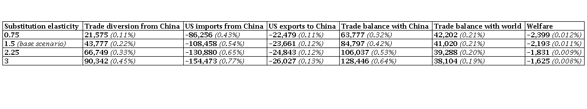 In line with the analysis of the sensitivity results of the Trade war scenario, the changing substitution elasticity did not significantly affect the US exports and the trade balance with the world’s figures. Consequently, it can be concluded that the US exports and trade balance with the world estimations tend to be robust. In relative terms, the estimations of other trade effects were found to be not significant in absolute terms.