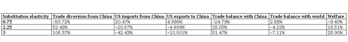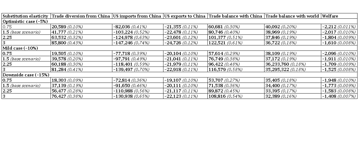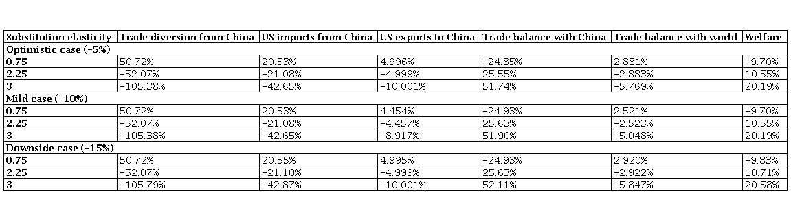 Also, based on the model results, the authors calculated that the US trade intensity with China would decrease by 1.13% and 0.29% when normalising the bilateral trade flows by the total trade and nominal GDPs, respectively.