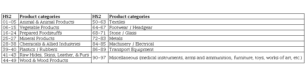 The SMART model reports are lengthy and present trade tariff effects per each HS6 product code and trading partner separately. Seeking to simplify the interpretation of the results, the model output was consolidated into 15 broader categories according to the HS2 product codes (Appendix A).