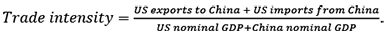 The trade intensity effect refers to a change in the trade volumes with a given trading partner. Tariffs are expected to reduce the trade intensity between the countries. According to Frankel and Rose (1998), the US trade intensity with China can be calculated by normalising the bilateral trade flows by the total trade (1)