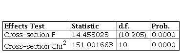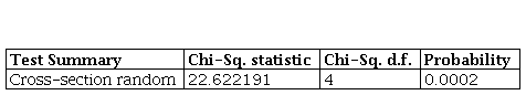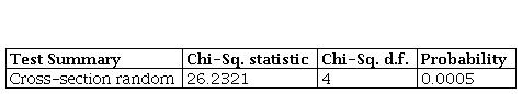 Table 5 shows that the probability value of the Chi-square value is 0.0000, and it is smaller than 0.05, then Ho is rejected. Thus the Chow-test determines that the panel estimation is fixed effect model (FEM).