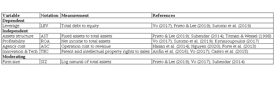 Yoo and Wu (2019) used data from the Korean stock market and applied SEM to analyze the determinants of leverage to find that asset structure () and profitability () retain robust relationships with leverage (market leverage, book leverage). Firm size shows a positive effect on leverage and, in line with some recent studies, maintains a stable relationship with capital structure. Yang, Albaity and Hassan (2015) found significant solvency determinants, namely growth (), firm size (), profitability (), and asset structure (). Titman and Wessels (1988), Mustilli, Campanella and D’Angelo (2018), and Sanil et al. (2018) predicted that leverage negatively correlated to uniqueness (innovations), firm size (), and profitability (). However, the correlations are weak. The other four variables, such as non-debt tax shield, growth, volatility, and collateral value were not significantly related to solvency. In a specific situation, the companies with leverage problems generally experience higher volatility and more frequent overreaction (Santosa & Hosen, 2011; Santosa, 2020).
