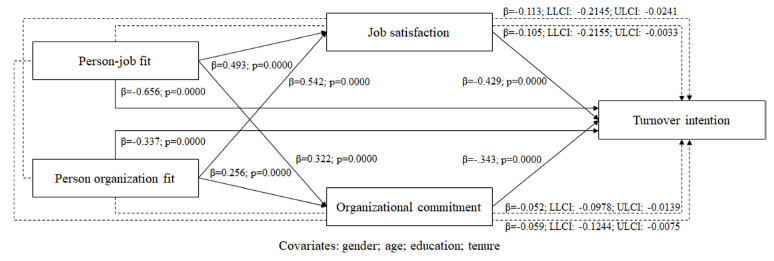 Hypothesis 4b: Organizational commitment mediates significantly the relationship between person-job fit and turnover intention.