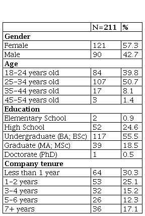 Of the 300 questionnaires distributed, 225 were returned, of which 211 questionnaires were valid. More than half of the respondents were female (57.3 percent), between 25 and 34 years old (50.7 percent), and had an undergraduate degree (55.5 percent). Table 1 summarizes the characteristics of the sample.