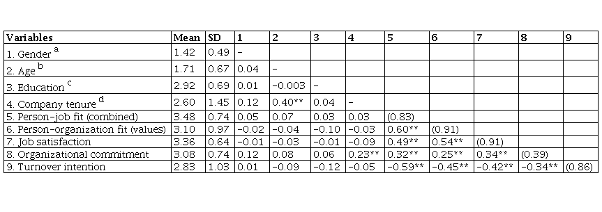 In this study, P-J fit (0.83), P-O fit (0.91), job satisfaction (0.91), and turnover intention (0.86) show good psychometric properties with Cronbach’s alpha within the accepted range (Nunnally, 1978). The reliability coefficient for organizational commitment (0.39), however, was lower. According to Barnette (2000), a low alpha score could be due to the negatively worded and reverse-scored items, whereas Cortina (1993) explains that a low number of statements within the scale could be another reason. The measure has three items, one of which is negatively stated.