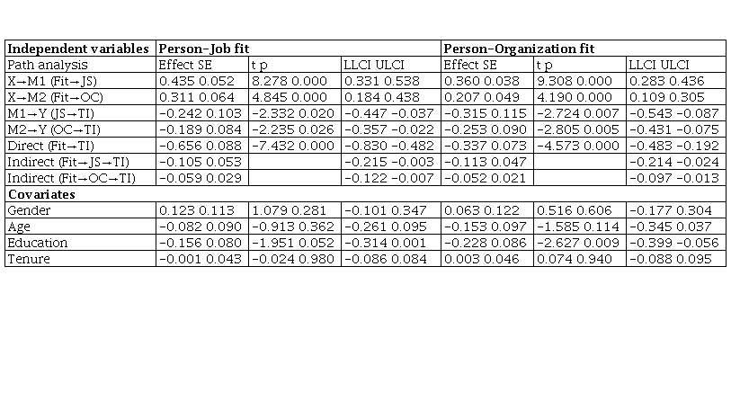 Four control variables (gender, age, education, and tenure) were entered as covariates in the regression model. There is no significant effect of gender, age or tenure in the relationship between fits and turnover intention. The relationship between fits and turnover intention is affected by education. The higher the level of education, the higher the negative effect of P-J fit on turnover intention (β=-0.156, p=0.052). Education has a statistically significant effect on the mediation of work attitudes in the relationship between P-O fit and turnover intention. Higher levels of education explain 22.81 percent (p=0.009) of variance in turnover intention when the effect of P-O fit is tested.