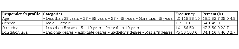 The authors conducted the study in 500 enterprises that produce machines and tools in Hochiminh city. There are 135,566 employees working in this industry including indirect employees and workers. The population of the study includes 27,000 indirect employees who work in different departments such as sales, accounting, operating and purchasing. The authors applied the minimum sample size standard for a CFA and SEM analysis of 150 with a model of 7 or fewer concepts (Hair et al., 2014). The study has fewer than 7 concepts, and the sample size should include at least 150 respondents. The sample was selected for the study by a convenience method. The authors selected 23 machinery enterprises and distributed 10 questionnaires to employees in each machinery enterprise. A total of 230 questionnaires were distributed to the respondents. There were 227 respondents who returned the answered sheets; the response rate was 98.6 percent. However, only 220 completed answer sheets qualified for data analysis, therefore the sample includes 220 respondents who meet the sample size standard.