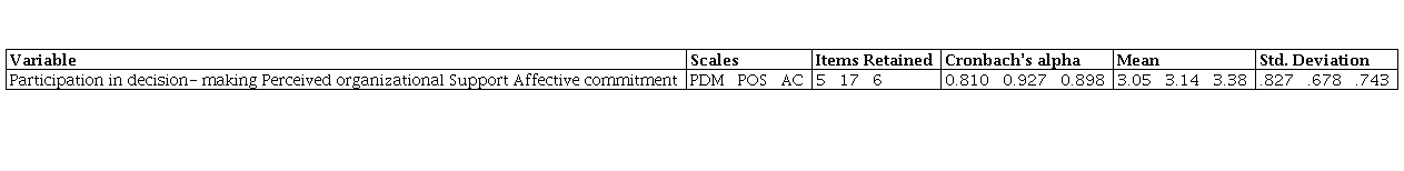 Table 2 also shows the mean values and standard deviations for the independent variables and the dependent variables. The results of the descriptive statistics indicate that workers agreed on PDM (mean = 3.05, std. = 0.827), POS (mean = 3.14, std. deviation = 0.677) and affective commitment (mean = 3.38, std. deviation = 0.742). Descriptive statistics generally indicate that respondents agreed with statements related to affective commitment, perceived supervisor support and PDM at moderate levels. Affective commitment had mean values greater than those of perceived supervisor support and participation in decision-making.