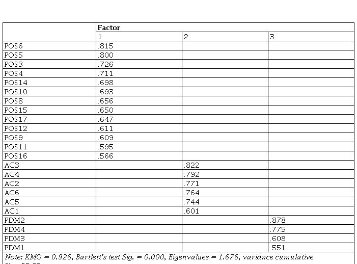The CFA analysis process requires the researcher to conduct the exploratory factor analysis (EFA) by principal axis factoring and promax rotation. The first time has KMO = 0.928 > 0.05, and the Bartlett‘s test has Sig. = 0.000, which shows that EFA is suitable. However, the POS1, POS2, POS7, POS10 and PDM5 have factor loading < 0.5 and were deleted to conduct the next EFA (Hair et al., 2009). The EFA in the second time has KMO = 0.926 and the Bartlett‘s test has Sig.= 0.000, which shows that EFA is suitable. The Eigenvalues = 1.676, and the data is extracted into the 3 factors in the research model. The variance cumulative percent = 53.03, which means that extracted factors explain nearly 53.03% of the variability in the original 3 variables in the research model (Hair et al., 2009). The results of EFA analysis indicate that POS remains in 13 items, PDM remains in 4 items and affective commitment remains in 6 items.
