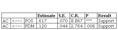 Table 5 indicates that hypotheses H1 and H2 are accepted. POS significantly impacts on affective commitment (β = 0.617, p < 0.01). PDM significantly impacts on affective commitment (β = 0.120, p < 0.06). The regression weights show that the perceived organizational support has the strongest impact on affective commitment.