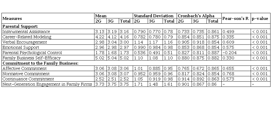 A correlation matrix was obtained, presented in Table 1 as well. All variables were correlated to each other. Normative commitment was most correlated with next-generation engagement at 0.768, while parental psychological control was least correlated with next-generation engagement at -0.204. While all variables are correlated to each other, not all relationships are significant. For this study, effects are considered significant if .-value < 0.05, and all values in the confidence interval belong to the same side of zero (positive or negative).