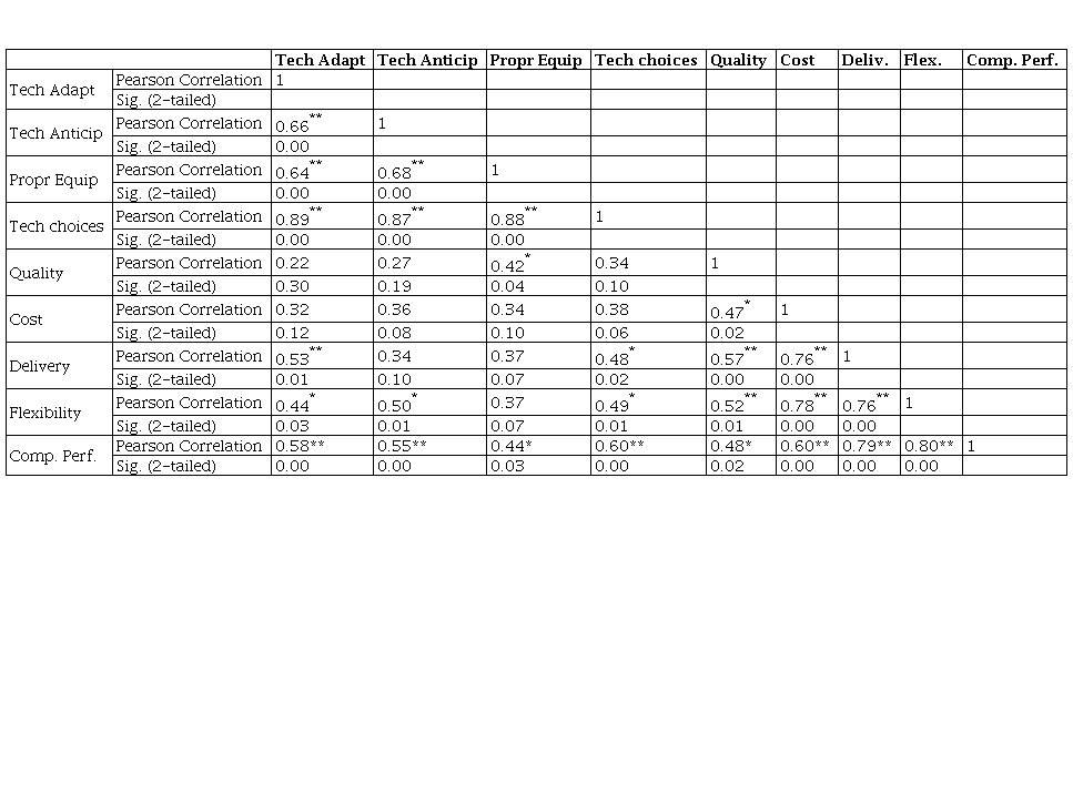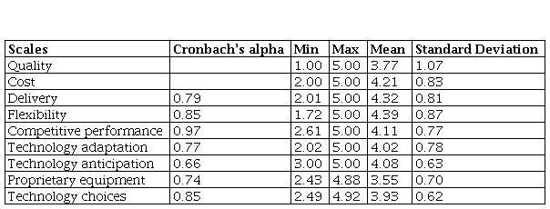 When it comes to descriptive analysis, all the variables have rather high maximum values being close to 5.0; the minimum values of technology variables seem to be higher than those of the competitive priorities. Mean value of proprietary equipment is the lowest among the technology variables, which indicates that the surveyed manufacturers might be overlooking the need for developing their own machinery and equipment for manufacturing, while they seem to pursue latest technology and adapt well to new technology (mean value > 4.0). Quality has the lowest mean value (3.77) as well as highest standard deviation (1.07) among the competitive priorities. This suggests that even though many companies are less concerned regarding manufacturing quality, still their priorities for Quality differ greatly.