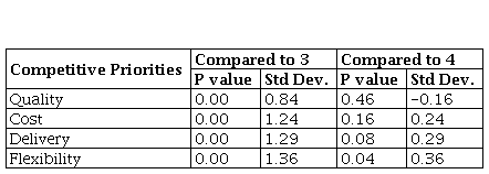 Following descriptive analysis, the research continues with Compare Means analysis of the four competitive priorities variables. First, means are compared to value 3, the neutral-value answer about the priorities in the questionnaire (5- Very important, 4- Important, 3- Normal, 2- Not too important, 1- Not important at all). Results shown in Table 3 indicate that all competitive priorities are positioned significantly higher than the neutral value 3, meaning that the surveyed companies seem to consider all the four priorities (quality, cost, delivery, flexibility) as important. This suggests that Vietnamese manufacturers might be pursuing multiple goals at the same time, which, according to Boyer and Lewis (2002), is ineffective because firms would then lose focus in terms of resources and lack differentiation in terms of competitive strategy.