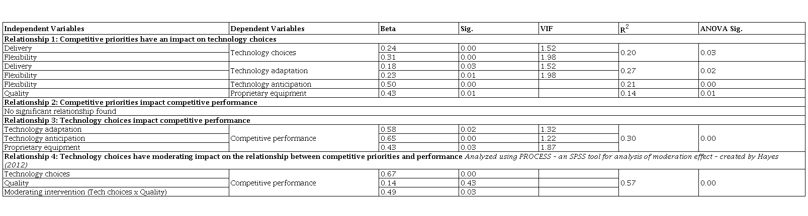 The results of linear regression analysis confirmed that the above causal relationships are statistically significant (0.05, with no multi-correlation effect – all VIF values smaller than 2), except for the relationship between competitive priorities and competitive performance. A summary of these causal relationships is shown in Figure 3.
