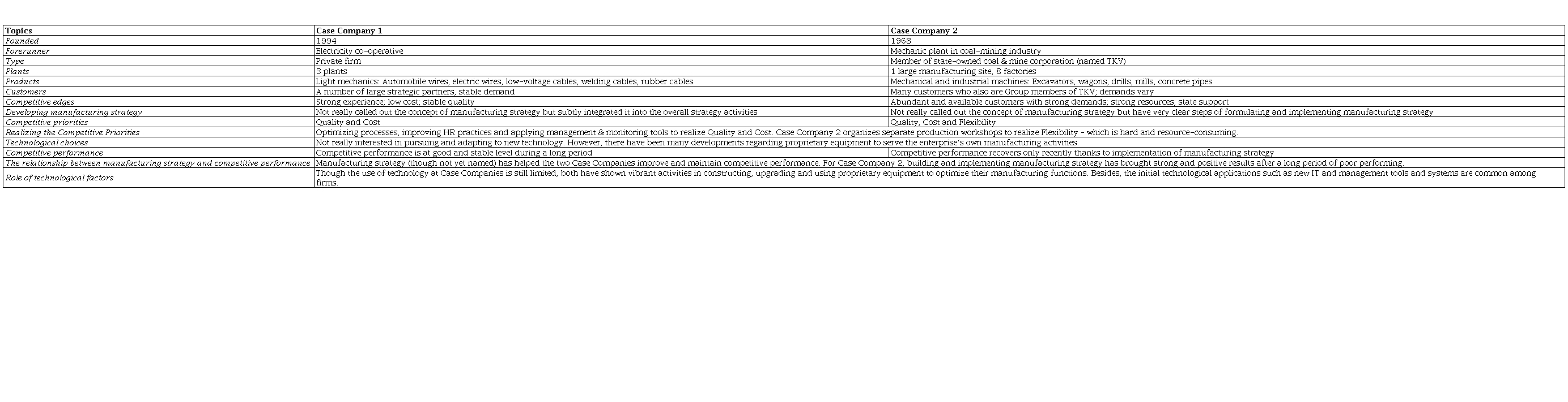 The qualitative part of this research aims to gain more in-depth understanding of manufacturing strategy at Vietnamese manufacturing enterprises, also to help explain and clarify the preliminary results that quantitative research has obtained. Accordingly, the case studies will examine the relationship between manufacturing strategy and competitive performance, the process of developing, orienting competitive priorities and implementing manufacturing strategy, together with the role of technology factors in realizing competitive priorities and improving business performance. The authors conducted a case study at two case companies and summarized the findings in Table 6.