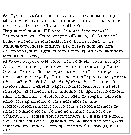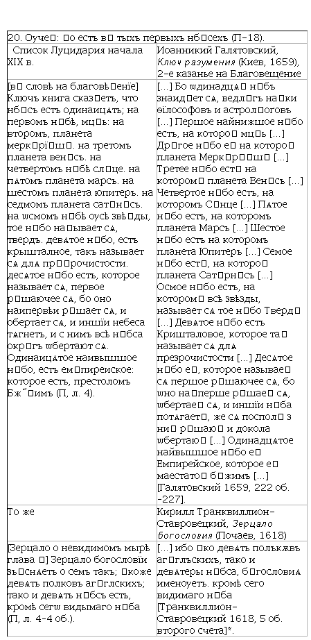 В своем пересказе компилятор несколько осовременил язык изложе- ния, сделав ряд замен: кришталовое → крышталное; першое → первое; наперше → наипервѣи; потѧгает → тѧгнетъ; докола → окрꙋгъ; маестатоⷨ → престоломъ. Вторая интерполяция может восходит к 1-му (Почаев, 1618) или 2-му (Унев, 1692), но не 3-му (Почаев, 1790) изданию Зерцала богословия Ки- рилла Транквиллиона-Ставровецкого (хотя 2-е оказалось мне недоступ- ным).
