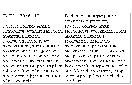 Тем не менее, текстов, написанных латиницей на цсл. языке, сохра- нилось немного — возможно, потому, что они создавались авторами по собственной инициативе для личного пользования и не подлежали рас- пространению. Пожалуй, самым известным образцом написанного лати- ницей цсл. текста является изданная в 1671 г. в Вильне книга Ecphonemata [Ohilewicz 1671], в первой части которой приводится цсл. литургия па- раллельно на цсл. и польском языках, причем цсл. текст напечатан поль- скими буквами. В литературе есть упоминание еще об одном подобном униатском издании — Акафисте Прсв. Богородице, изданном в Почаеве на цсл. языке польскими буквами [Хойнацкий 1871, 451].