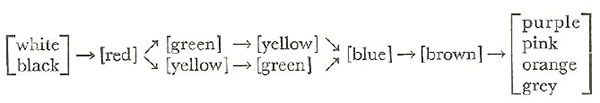Według B. Berlina i P. Kaya wyodrębnione według powyższych kryteriów nazwy barw podstawowych tworzą ewolucyjny szereg, w którym każdy termin ma dokładnie wyznaczoną pozycję, co ilustruje następujący schemat: