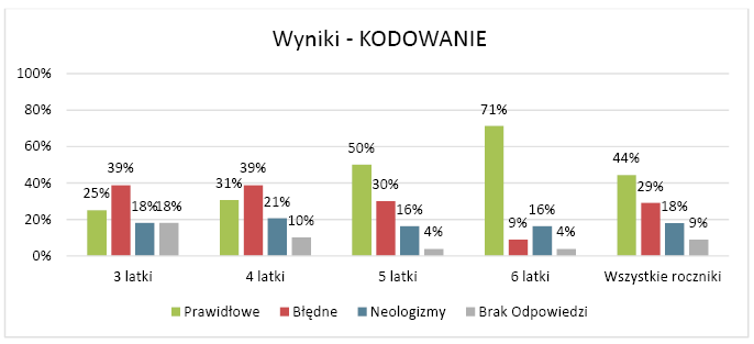 Także w przypadku dekodowania widoczne jest budzenie się świadomości słowotwórczej wraz z wiekiem badanych. Wśród wszystkich grup 69% to poprawnie sformułowane parafrazy, 25% . błędnie, a jedyne 6% to brak odpowiedzi. Wśród błędnych parafraz dominowały skojarzenia dzieci związane z derywatem, odwołujące się do rzeczywistości pozajęzykowej, której nie sposób ocenić, choć zdarzały się odpowiedzi pozostające w związku semantycznym z podstawą, np. kredkarz to ten, kto rysuje. dekorator, to ten, kto robi smoka. główkator, to ten, kto myśli; a bankowiec, to ten, kto robi kasę.