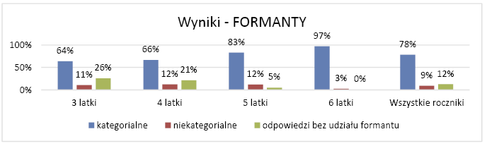Zdecydowana większość dzieci (78%) prawidłowo użyła formantu, który był przewidziany w zadaniu, lub też zastosowała inny formant, odpowiedni dla badanej kategorii. Najlepiej, bo niemal bezbłędnie, poradziła sobie z tym grupa sześciolatków, używając 97% formantów kategorialnych. Jak widać, prawidłowe użycie formantów jest wprost proporcjonalne do wieku: najstarsi badani używali ich najczęściej, najmłodsi . najrzadziej (64%). Warto dodać, że wskaźnik najmłodszych jest również na bardzo wysokim poziomie.