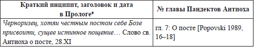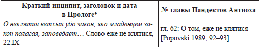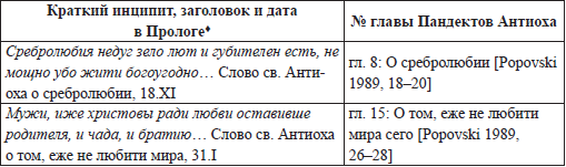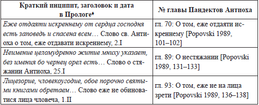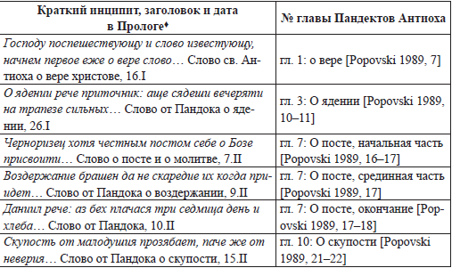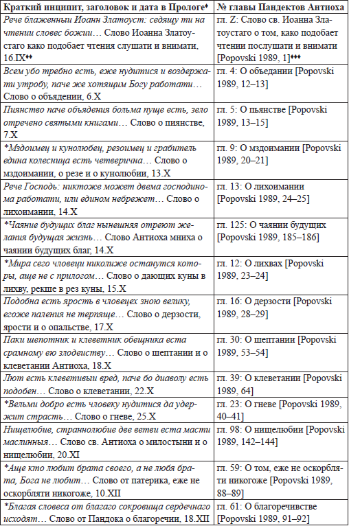 В восточнославянской книжной традиции на протяжении XII‒XVII вв. фрагменты Пандектов заимствовались в Пролог, календарный сборник житий и поучений. Обширный блок статей был включен в древнейший перевод Пролога на раннем этапе формирования его назидательного раз- дела. В старших списках пространной редакции, составленной в 60-е гг. XII в. [Лосева 2009, 77], на первое полугодие представленa 21 статья из Пандектов, 10 из которых были унаследованы краткой редакцией Про- лога. Поучения стабильно повторяются в старших списках краткой ре- дакции, включая 2-ю часть древнейшего списка Соф. 13246, датируемую серединой XIII в. Отождествленные статьи из Пандектов перечислены ниже в порядке их следования в пространной редакции Пролога, наличие текста в краткой редакции отмечено звездочкой, атрибуция выполнена по изданию древнейшего списка Пандектов [Popovski 1989]: