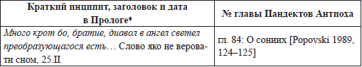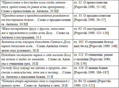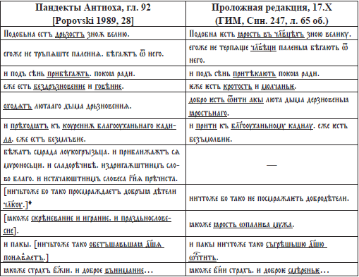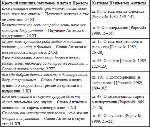 Киево-софийская редакция, известная в трех списках осенне-зимнегополугодия (КСоф. 273с/131, Зл.-Мих. 529п/1643 и МГАМИД 710), харак-теризуется древностью редакционной основы и значительно обновлен-ным назидательным разделом, см. подробнее [Чистякова 2017, 15‒77]. Напервое полугодие в ней представлено 40 индивидуальных поучений, трииз которых восходят к Пандектам Антиоха: