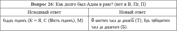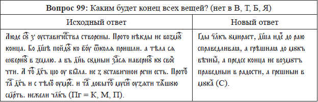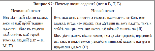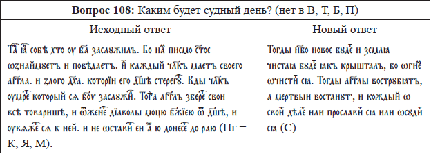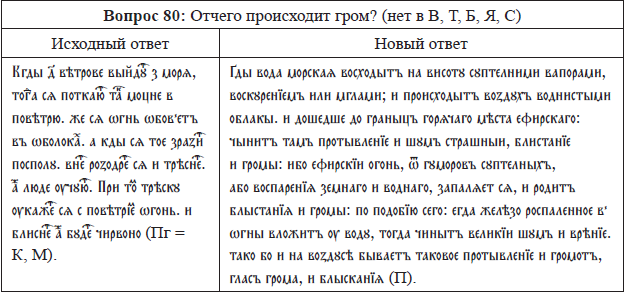 Бессмысленный ответ списка Б является искажением более ран- ней версии, представленной в источнике Т (хотя механизм искажения не вполне понятен). Однако данное обстоятельство не свидетельствует о взаимном текстологическом родстве этих двух рукописей, поскольку тот же обновленный ответ читается также в единственном списке ино- го (древнейшего) руськомовного перевода чешского Луцидария [Žeňuch 2013, 293;Žeňuch 2021, 47], куда он тоже, судя по всему, попал вторично из тех же посторонних (церковнославянских) вопросно-ответных источ- ников, например, из Беседы трех святителей [см.: Пыпин 1862, 169; Ти- хонравов 1863, 432–433; Франко 1906, 7, 402, 408, 411; Милтенова 2004, 396–397].