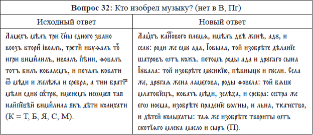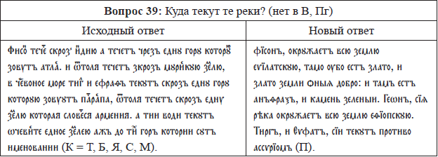 Ниже в таблицах я привожу выявленные случаи замены исходных ответов учителя на вопросы ученика содержательно новыми текстами. Иногда они составлялись с использованием письменных источников, не- которые из которых установлены мною и указываются ниже в коммента- риях, следующих после каждого текста.