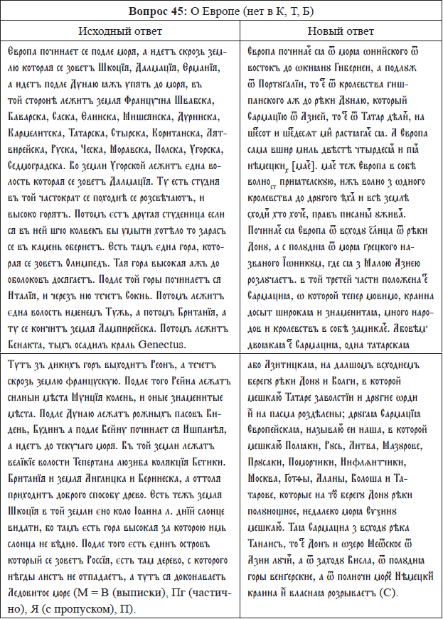 Ниже исходные (переводные) и новые ответы цитируются по наиболее раннему источнику, содержащему полный ответ (а не отдельные выписки из него, как в списке В), с указанием (после знака равенства) иных спи- сков, содержащих ту же текстовую версию. При этом знак = означает тож- дество текста, но не его формального выражения, которое, как обычно, подвержено значительному варьированию по спискам, представленному языковыми заменами, пропусками, добавлениями, частичными перефор- мулировками и т.п. Следует иметь в виду, что исходный вариант текста, цитируемый по старшему полному списку, также может содержать вто- ричные искажения. Нумерация вопросов и ответов дается по реконструк- ции первоначальной структуры руськомовного перевода 1636 г. [Темчин 2020а]. Явные ошибки словоделения исправляются без оговорок