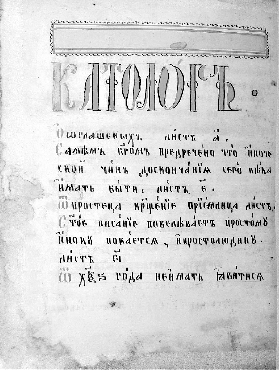 На первом листе сборника в печатную рамку инок вписал традиционные по форме сведения о переписке книги (запись очень дефектная): “Сию кн<игу> <пи>салъ м<ногогре>шной ино<къ> Киприян <…> влето 74<…> месяца <…>” (ОПИ НГОМЗ, НГМ КП 38189, КР-439, л. 1). Основная часть озаглавлена “Католог” и содержит множество кратких выписок из уставных, поучительных, церковно-канонических, исторических и полемических сочинений. Помимо выдержек из широко распространенных книг, достаточно часто включавшихся в подобные рукописи (“Пролог”, “Евангелие учительное”, “Альфа и Омега” и др.), здесь имеются старообрядческие сочинения против “пилатовой титлы” и “новоженов” — излюбленных тем федосеевской полемики. Обращает на себя внимание включение в состав сборника, наряду с выписками из “Отеческих завещаний”, также деяний Московского федосеевского собора 1883 г., печатный текст которого хранился в скитской библиотеке.