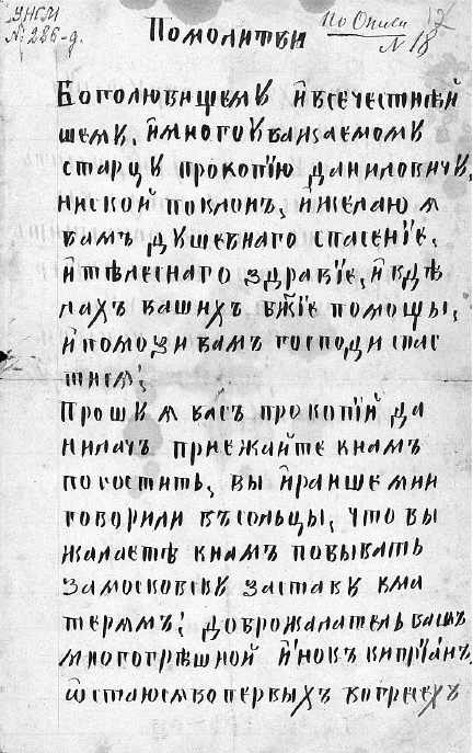 В нем отец Киприан приглашает своего адресата в гости. С учетом того, что инок просит писать ему “за Московскую заставу, по Вольковской улицы дом № 51”, письмо написано до 1888 г., кода Киприан покинул Заставскую обитель и обосновался на Ильюшкином острове. Так или иначе, корреспонденция фиксирует достаточно тесные контакты скитоначальника со староверами Новгородской и Псковской губерний. Возможно, часть рукописей, конфискованных в 1890 г. и отмеченных в описании книг братства Св. Софии, была переписана этим незаурядным и весьма активным деятелем местного старообрядчества.