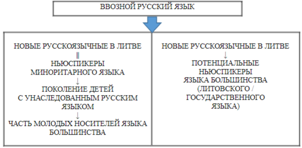 В Литве обозначение русского языка как ввозного должно иметь количественную и региональную обусловленность: с этим термином целесообразно связывать те регионы Литвы, в которых приток относительно большого количества ньюспикеров способствует устойчивости и даже укреплению позиций “местного” русского языка во многих сферах общения, а в итоге — возможности приезжающих русскоязычных ограничиваться минимальной компетенцией в литовском языке, в особенности если Литва не воспринимается ими как целевая страна. В тех же случаях, когда для ввозящих русский язык иммигрантов и их детей Литва оказывается государством не транзита, а переселения, они способны эффективно пополнять и категорию ньюспикеров литовского языка.