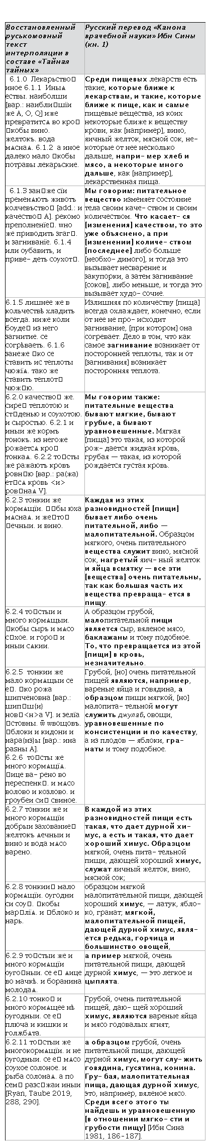 Во-первых, руськомовная версия передает текст Ибн Сины с небольшими сокращениями. Некоторые из них, по-видимому, появились в результате случайного пропуска текстовых фрагментов из-за homoioteleuton’а, поскольку выпущенный текст находится между повторяющимися словами: а) 6.1.2 (между дальше . дальше русского перевода арабского текста); б) 6.1.3 (между количеством . количеством); в) 6.2.11 (между химус . химус). В последнем случае пропуск привел к значительному искажению смысла: после слов о грубой, очень питательной пище, дающей дурной химус (т.е. жидкое или полужидкое содержимое желудка или кишечника), приведен пример грубой, малопитательной пищи, дающей дурной химус: вяленое мясо. Такие пропуски могли возникнуть на любом (арабском, еврейском или уже славянском) этапе бытования текста.