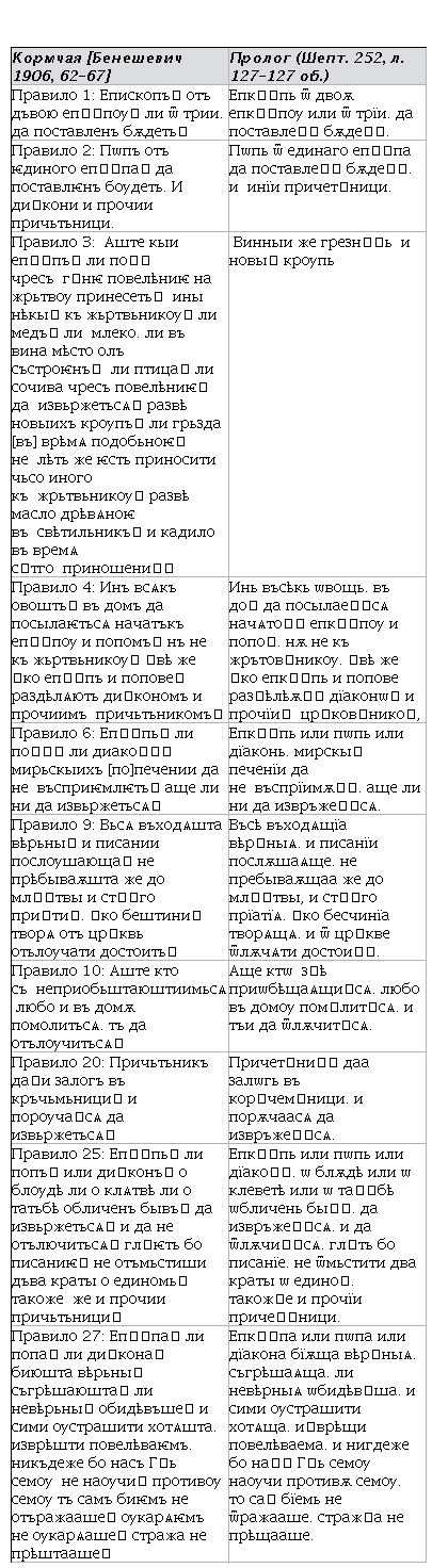 В пролог Шепт. 252 был включен отрывок из начальной части древнеславянской редакции Кормчей — Собрания правил свв. апостолов. Заимствованный фрагмент соответствует правилам 1–4, 6, 9, 10, 20, 25, 27, в которых затрагиваются вопросы хиротонии епископов и правила поведения церковных служителей всех рангов. Книжник не только сделал выборку, но и произвел некоторые сокращения источника. Ниже параллельно приведены апостольские правила Кормчей и соответствующий им проложный текст (расходящиеся фрагменты выделены курсивом):