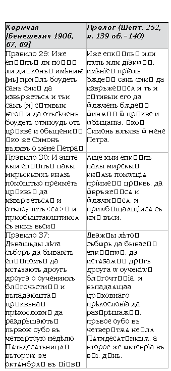 Заимствование близкорасположенных фрагментов одного источника и идентичная манера работы с оригиналом свидетельствуют об одновременном внесении текстов в Пролог одним и тем же лицом. Время включения поучений в Пролог не поддается точному определению. В структуре Шепт. 252 выделяются как архаичные черты (обилие тропарей, часть из которых совпадает с Соф. 1324), так и более поздние инновации (перенос традиционных житий и поучений на иные даты, замена отдельных проложных житий минейными текстами, эпизодическая сверка со Стишным прологом7, общие поучения с прологами XV‒XVII вв., характерными для книжной традиции ВКЛ, небольшое число новых назидательных статей). В списке Шепт. 252 преобладают инновации, поэтому более вероятно, что две статьи из Кормчей (см. их текст в приложении) в данной разно видности Пролога также относятся к числу более поздних редакционных изменений.