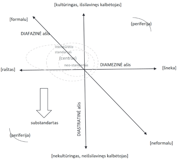 Aptardamas dabartinės italų kalbos „architektūrą“, Berruto pabrėžia, kad sociolin- gvistinis šio kalbos atmainų žemėlapio centras nėra schemos geometrinis centras, o yra pasislinkęs labiau link rašto, formalios, aukštesnio registro kalbos ir sieja tai su standartinės italų kalbos, kuri tradiciškai remiasi rašytiniu, literatūriniu, pakylėtu vartojimu (1987, 22). Galime matyti, kad lietuvių kalbos situacija šiuo aspektu gan panaši. Tą pačią schemą vėliau aptardami kiti italų kalbininkai centrą pozicionuoja dar kiek aukščiau diastratinės ir diafazinės ašies atžvilgiu ir teigia, kad literatūros kalba praktiškai atitinka mokykloje dėstomą bendrinę kalbą, o italų kalbos neostandartas (it. neo-standard) iš esmės atitinka žurnalistinę kalbą (Serianni, Antonelli 2011, 105). Matyti, kad standarto sąvoka išties atitinka bendrinės kalbos sąvoką lietuviškai (žr. Ramonienė et al. 2012), todėl šiame straipsnyje ir vartojamos sinonimiškai. Verta turėti galvoje tai, kad Italijoje italų kalbos vartojimas valstybinių institucijų nėra reguliuojamas taip, kaip Lietuvoje, natūralus kalbos vartojimas ir plėtojimasis plačiuose sluoksniuose, pvz., žiniasklaidoje, ir jos ilgalaikiai pokyčiai traktuojami kaip neostandartas. Vienas iš standartinės kalbos bruožų yra tai, kad ji yra sunorminta, o neostandartas apima ir natūraliai pakitusią, visuomenei priimtiną ir vartojamą kalbinę atmainą, nebūtinai jau atspindimą gramatikose ir žodynuose (t. p. žr. Berruto 2017).