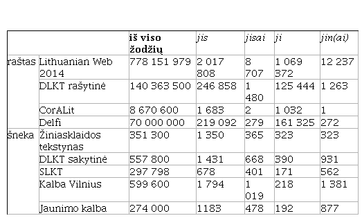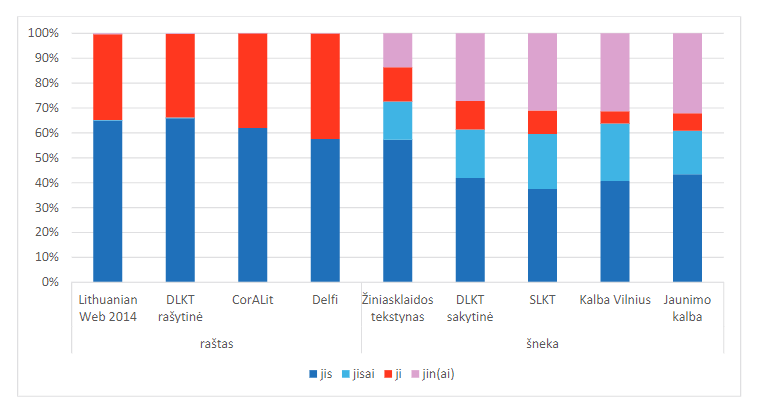 1 lentelėje pateikiami tekstynų duomenys: nurodoma tekstyno apimtis žodžiais ir kon- kretus analizuojamųjų įvardžių pavartojimų skaičius. Kadangi šis tyrimas yra pirmas tokio pobūdžio, pateikiami realūs tekstynuose randami pavartojimų skaičiai. Lentelėje duomenys pateikiami suskirstant į rašytinę ir sakytinę kalbą, pagal tai atskirtos ir skirtingos DLKT dalys. Įvardžių trumpasis ir ilgasis variantas skaičiuojami atskirai, o jų fonetiniai variantai skaičiuojami drauge sudėjus, t. y. isai prie jisai, o jin ir inai prie jinai. Šie fonetiniai variantai (isai, jin, inai) sudaro tik nedidelę dalį, o galimas variantas is .jis), kurio atvejų pasitaiko vos keletas, neskaičiuotas, nes gali sutapti su kitų žodžių tarimo netikslumais (pvz., prie- linksnio iš) ar pan. Šie fonetiniai variantai galėtų būti veikiami tiek diatopijos, tiek greito kalbėjimo tempo, tačiau jų per mažai, kad būtų galima daryti labiau apibendrintas išvadas. Tiriamųjų įvardžių vartojimo proporcijos geriau atsiskleidžia 2 paveiksle.