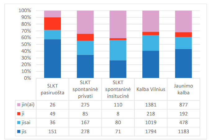 Žvelgiant atskirai į vyriškosios ir moteriškosios giminės įvardžių vartojimą, ilgieji variantai pasiruoštoje kalboje sudaro maždaug penktadalį vyriškosios giminės įvardžių ir apie trečdalį (35 proc.) moteriškosios giminės asmeninių įvardžių. Būtent šiomis proporcijomis paruošta kalba skiriasi nuo spontaniškos, kurioje vyriškosios giminės ilgasis variantas jisai sudaro nuo trečdalio iki pusės (čia išsiskiria spontaninė instituci- nė šneka, kurioje šis ilgasis variantas vartojamas net 53 proc. atvejų), o moteriškosios giminės ilgasis jinai ar fonetiniai variantai nuo 75 iki 93 proc. atvejų. Kaip matyti, šiame bendrame kontekste visiškai neišsiskiria nei galimai diatopiškai žymėtieji teks- tynai („Kalba Vilnius“ ir Vilniaus jaunimo kalbos), nei vienos amžiaus grupės kalba (Vilniaus jaunimo kalba).