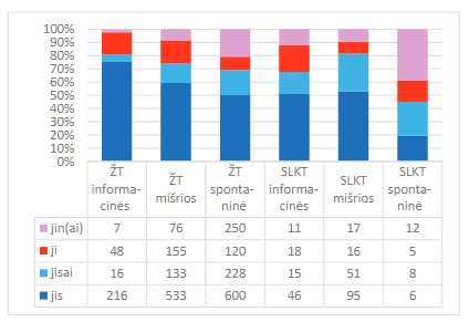 Atskirta SLKT spontaninės institucinės kalbos dalis galėtų rodyti skirtumą diafazinėje dimensijoje, tačiau šio tipo pokalbių, kaip minėta, yra mažiau nei kitų, tad kol kas bus susi- laikoma nuo labiau apibendrinančių išvadų apie šią sritį. Apibendrinant visus spontaniškos nepasiruoštos kalbos duomenis galima tvirtai teigti, kad ilgasis moteriškosios giminės įvardis jinai yra labai aiškiai dominuojantis spontaninėje sakytinėje kalboje, o trumpojo varianto ji vartojimas labai marginalus. Kiek kitokia situacija su vyriškosios giminės įvardžiais, kur trumpasis variantas jis vartojamas daugiau nei pusę atvejų, tačiau ilgojo varianto jisai vartojimas taip pat labai gausus.