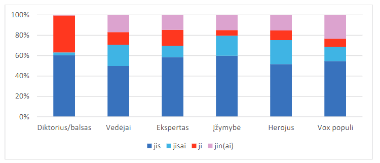 Matyti, kad mišraus tipo laidose įvardžių vartojimo pasiskirstymas yra panašus į pasiruoštos kalbos proporcijas, o spontaninės kalbos žiniasklaidoje įvardžių proporci- jos yra labai panašios į tas pačias visiškai spontaninėje kalboje. Kitaip tariant, jis yra dominuojantis vyriškajai giminei, o jinai labai varžosi ir kai kur net nurungia trumpąjį variantą ji. Suprantama, čia aptariamos laidos turi įvairių kalbėtojų: yra ir skaitomo teksto, ir spontaniškai kalbinamų žmonių gatvėje, vieni pokalbiai labiau, kiti mažiau paruošti ir dialoginių laidų metu. ŽT kalbėtojai tekstyne sužymėti taip pat pagal savo vaidmenis konkrečioje laidoje ir išskirti tokie kalbėtojų tipai (išsamiau žr. Nevinskaitė 2017): pranešėjas/diktorius/balsas už kadro (skaitomas tekstas), pokalbių laidos vedėjas (moderuoja pokalbį), ekspertas (kalbinamas asmuo dėl dalykinio vertinimo), įžymybė (daugiau ar mažiau viešai pažįstamas asmuo, kalbantis apie save ar savo veiklą), herojus (paprastas žmogus, laidoje kalbinamas dėl savo patirties, pvz., nukentėjusysis ar pan.), vox populi (gatvėje kalbinamas žmogus). Tai leidžia pažvelgti į įvardžių vartojimą ir pagal šiuos vaidmenis, žr. 5 paveikslą.