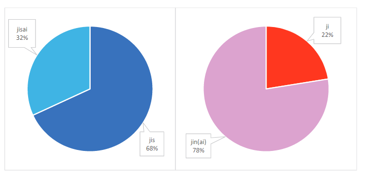 Svarbu atsižvelgti, kad skirtingų giminių įvardžių variantų vartojimas gan reikšmingai skiriasi tarpusavyje, tačiau visais tirtais atvejais išlaiko tą pačią tendenciją. Vyriškajai giminei nurodyti ilgasis variantas jisai vartojamas apie trečdaliu atvejų. Moteriškajai giminei nurodyti ilgasis variantas jinai (ar jo fonetiniai variantai) vartojamas net apie 80 proc. atvejų. 6 paveiksle pateikiamos diagramos su įvardžių pasiskirstymu vyriškajai ir moteriškajai giminei atskirai. Čia skaičiuoti duomenys kartu sudedant visus naudotus sakytinės kalbos tekstynus, atskyrus tik ŽT diktorių/balso už kadro duomenis, kurie, kaip aptarta anksčiau, yra skaitomas tekstas. Tokiu būdu šie duomenys remiasi per 2 milijonų žodžių sakytinės kalbos iš įvairių sričių apimtimi.